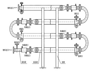 对于强放热的气/液反应过程可以采用JHF-Ⅲ型强化传热混合反应器。JHF-Ⅲ型强化传热混合反应器垂直安装,一般情况下,反应器内气液两相并流向上运动,反应器底部配有专门设计的气体分布器。特殊情况下,反应器内气液两相也可以并流向下运动,反应器顶部配有专门设计的液体分布器。主要用于: