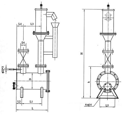 5、水封高度>7000mmH2O高压多室排水器外形尺寸见图五、图六、表五 |