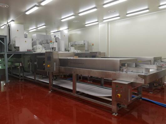 3、進(jìn)出料機(jī)座內(nèi)部采用角鋼焊接結(jié)構(gòu),機(jī)座內(nèi)固定電機(jī)、減速機(jī)、鏈輪等,外層為可拆卸不銹鋼板外罩,整機(jī)隧道內(nèi)安裝不銹鋼托輥承載塑料鏈板傳送帶,鏈板輸送帶為微波專用帶,運(yùn)行平穩(wěn)可靠。